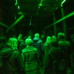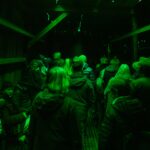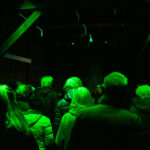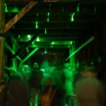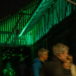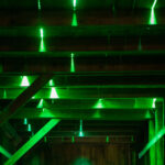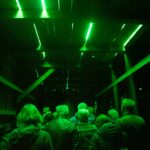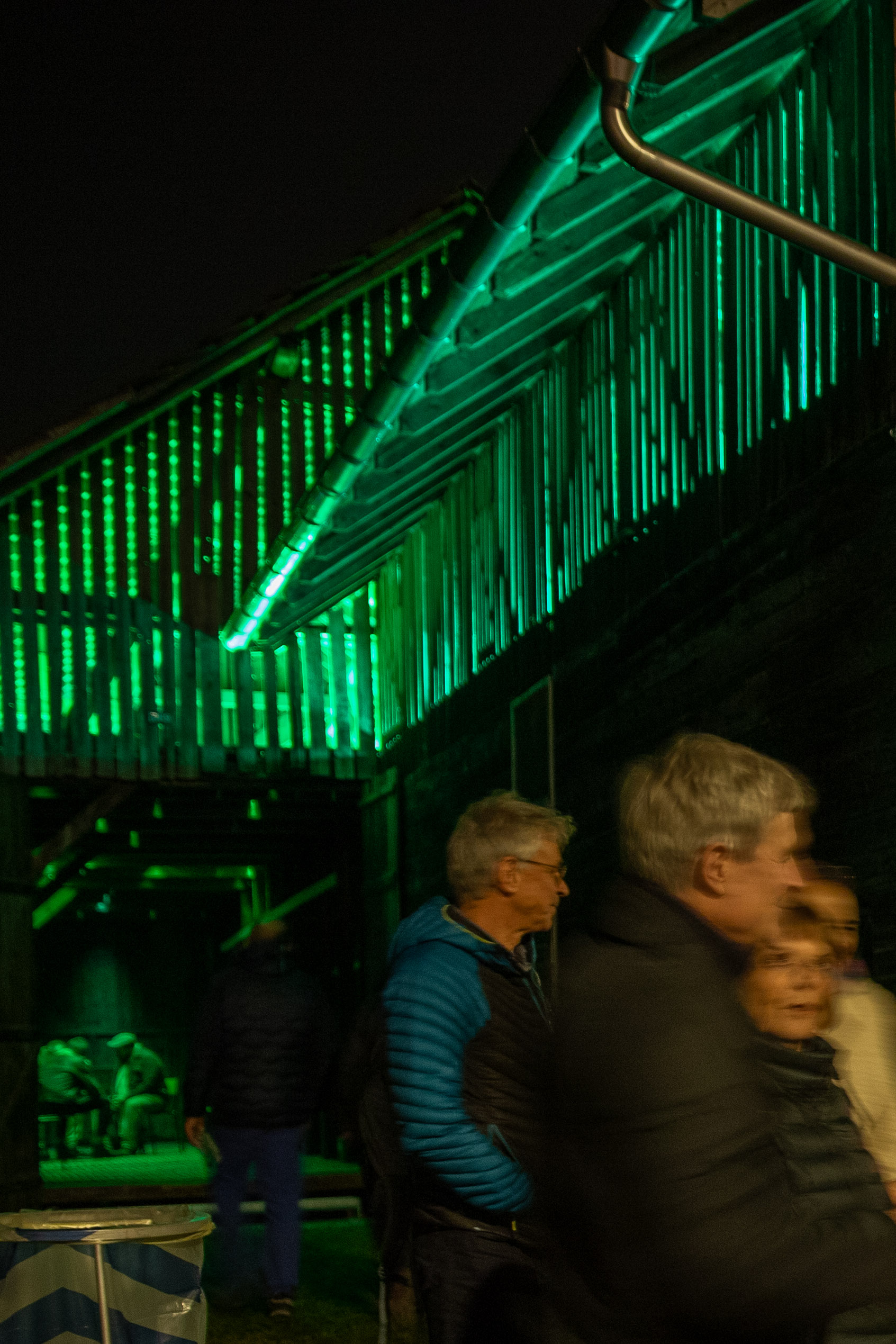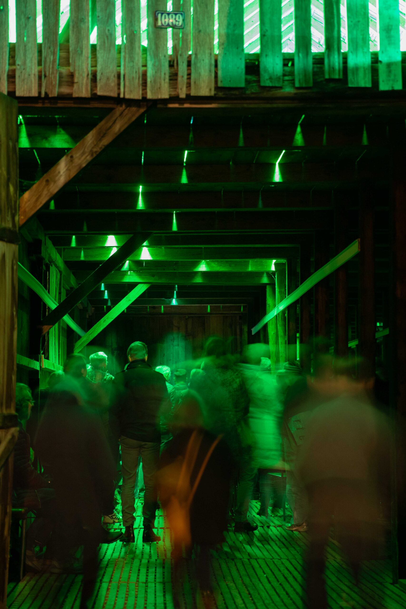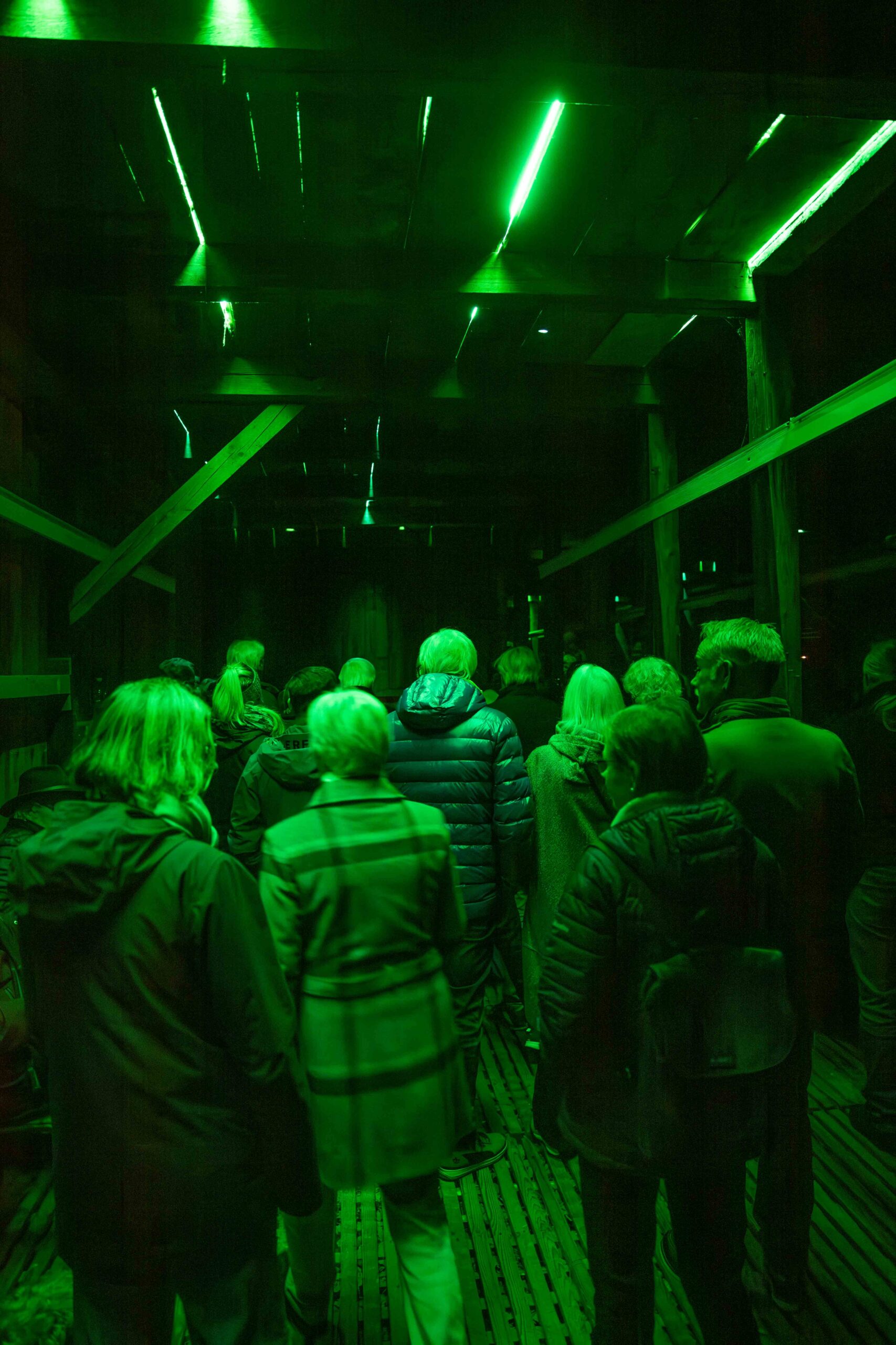 Abends erstrahlt das Gebäude in sattem Grün: 160 Meter handgefertigte Neonröhren lassen das Licht durch Spalten und Ritzen der durchlässigen Bauweise nach aussen dringen, sodass die Hütte geheimnisvoll in die Landschaft leuchtet und bereits von Weitem sichtbar ist. Im Innern sorgt die Klanginstallation dafür, dass Besucher nicht nur sehen, sondern auch hören und spüren können: feine Schwingungen, verstärkte Geräusche der Transformatoren und charakteristisches Knistern machen den Raum selbst zum Instrument.